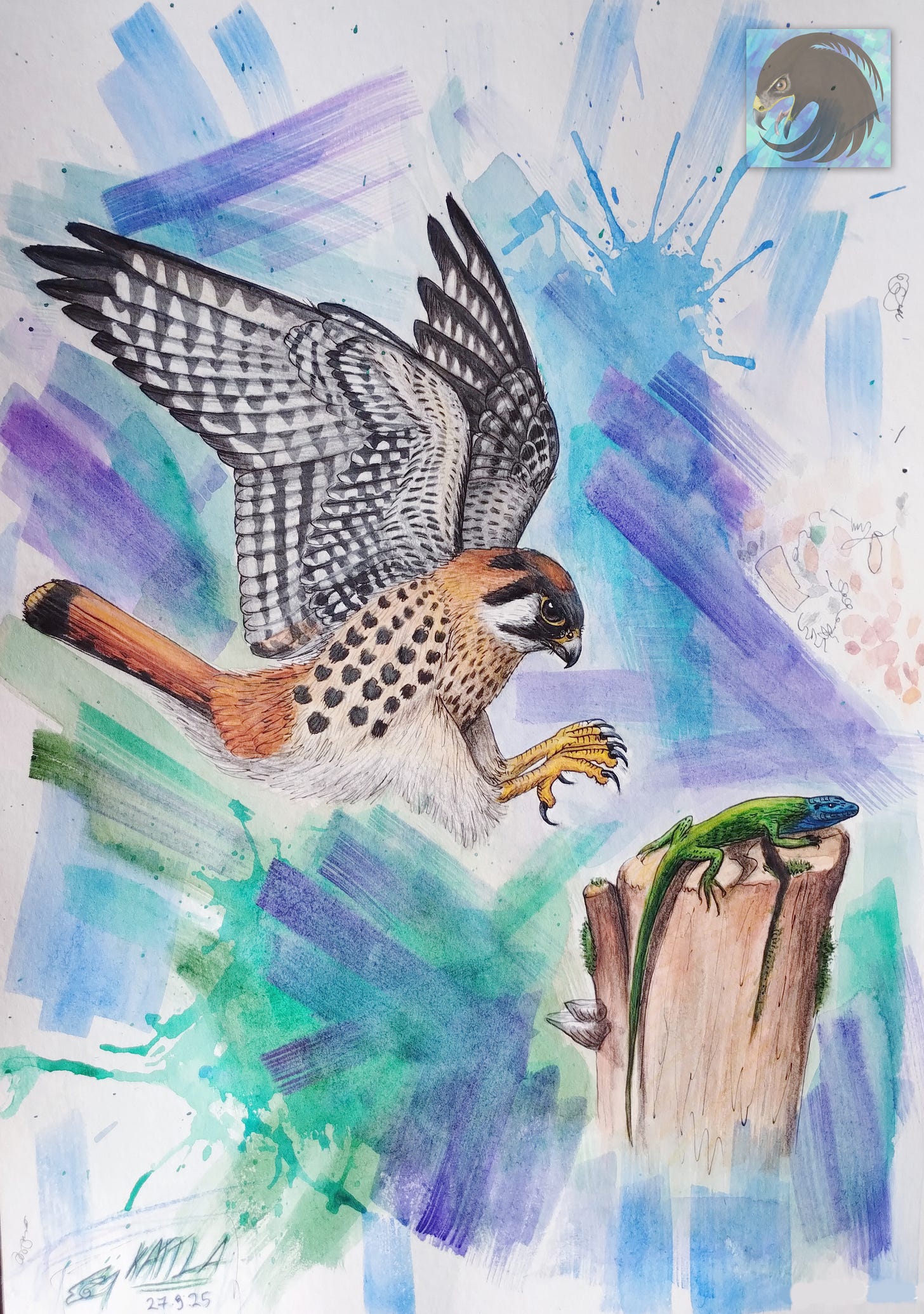 American kestrel striking a European green lizard.